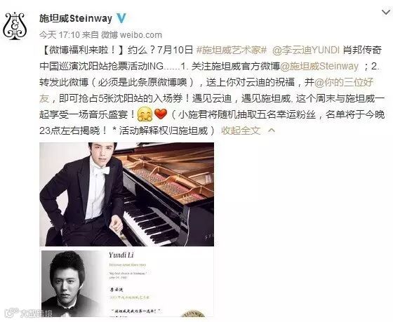 关注施坦威钢琴官方微博,@三位好友并写下祝福语转发以下这条微博,即有机会获得李云迪中国巡演7月10日晚沈阳站入场券一张哦!