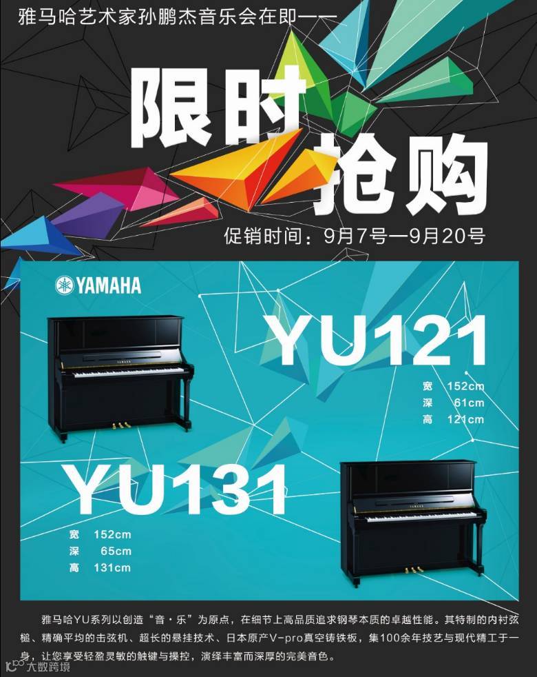 雅马哈艺术家孙鹏杰《琴书》独奏音乐会在即,为迎接这一秋季大型演出活动,旺族琴行举办限时对特定型号YU121、YU131进行大型抢购活动!我们已用洪荒之力!你准备好了吗?详情请到店咨询!