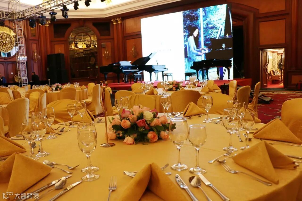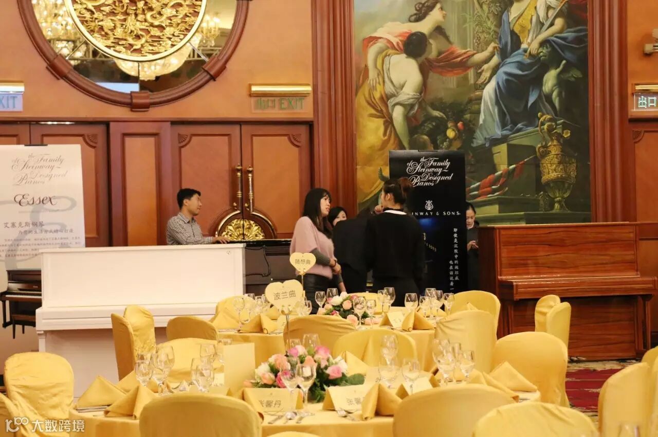 宴会厅内典雅又不失尊贵的装饰与台上的施坦威家族钢琴相得益彰。