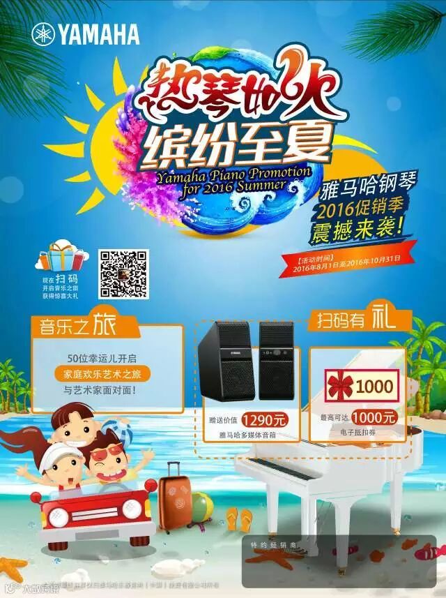 扫二维码关注“雅马哈钢琴”微信公众号,在公众号下方“夏季促销”菜单中领取最高1000元的优惠券;
