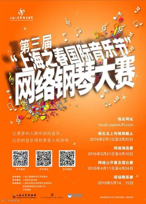 为落实《国家“十二五”时期文化改革发展规划纲要》部署,充分发挥科技创新对文化发展的重要引擎作用, “第三届‘上海之春国际音乐节’网络钢琴大赛”将于2016年 2月-5月举办。