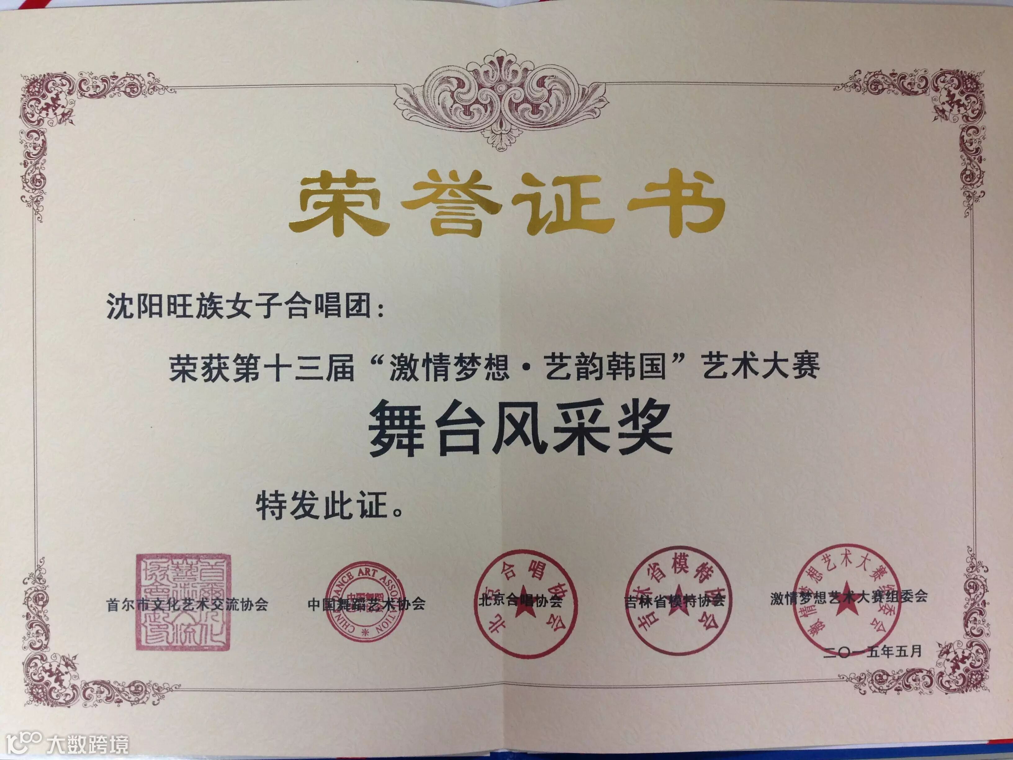 2015年5月,应首尔文化艺术交流协会、国际文化艺术研究协会、北京合唱协会、激情梦想艺术大赛主委会的邀请,旺族女子合唱团一行35人奔赴韩国参加了第十三届“激情梦想·艺韵韩国”艺术大赛,在这一高手如云的比赛中力压群雄,得到了专家评委的赞扬和肯定,获得了金奖、优秀指挥奖、优秀钢琴伴奏奖、优秀组织奖和舞台风采奖等荣誉。