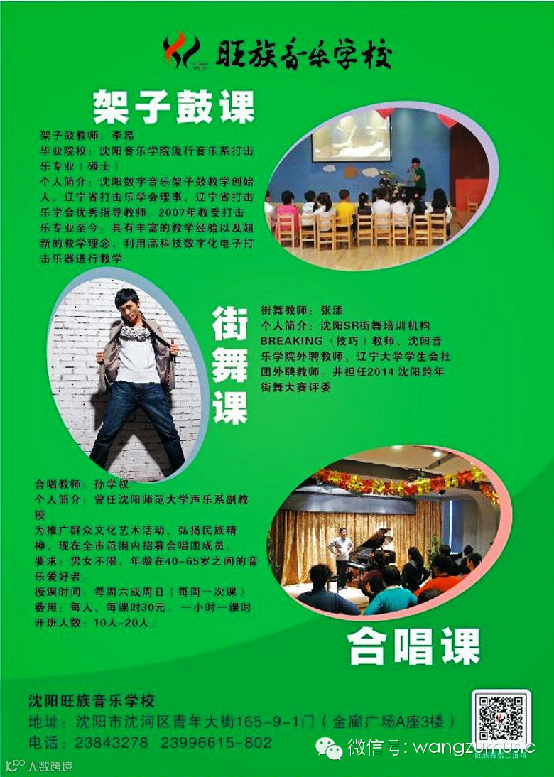 为了满足广大学员家长的要求,旺族琴行将在5月中旬后增加架子鼓、街舞、合唱班三个培训课程,报名活动正在火热进行当中,详情请咨询课程顾问。