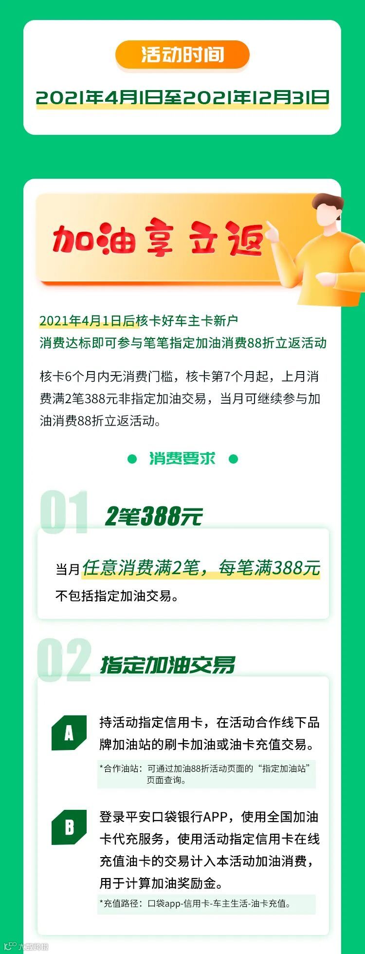 5. 如持卡人在活动期间发生任何违反本活动规则及其他相关规定的,银行保留拒绝该持卡人参加本活动及取消其获赠任何奖励的权利;如遇特殊情况未收到返现或对平安口袋银行APP查询到的2或4笔388元非指定加油消费、加油消费、最终返现金额有异议,请于2022年3月31日前致电平安银行信用卡客服热线95511-2反馈。