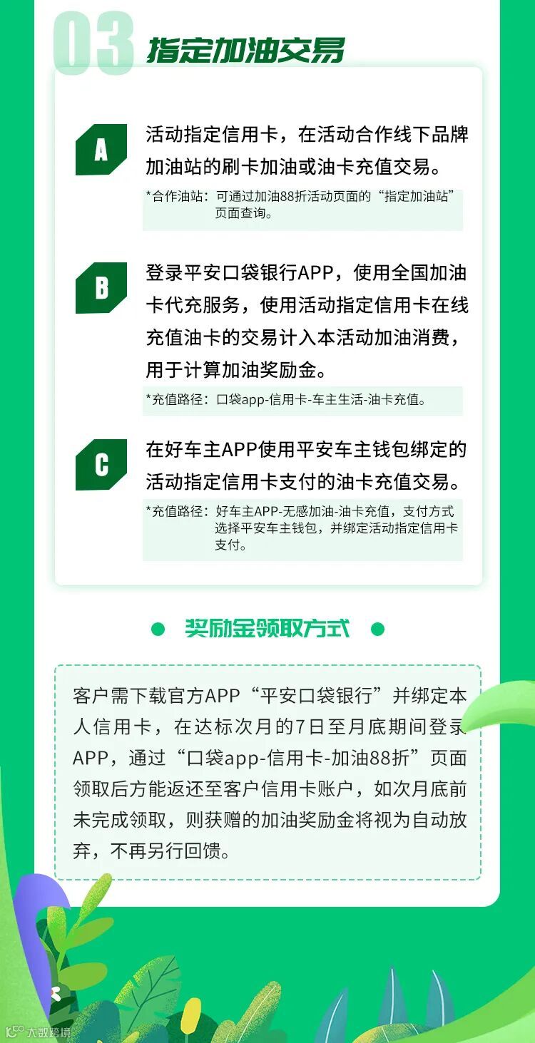 3. 活动合作指定加油站:本活动指定合作加油站可通过活动页面“指定加油站”查询。若出现因加油站单方面原因导致发生的交易不能正常进行等影响持卡人无法参与活动的情况,如加油站刷卡POS机故障、加油站临时停业、加油站搬迁等,请持卡人与商户直接沟通解决,银行不再另行通知持卡人;若持卡人采用充值加油卡的方式参与本活动,在办理加油卡及加油卡充值业务时,须遵循加油站内相关规定,该业务受理时间以加油站内公告为准;我行非本次活动的商品或服务提供商,如发生与商品或服务有关的争议,我行将协助持卡人与商家协商解决。