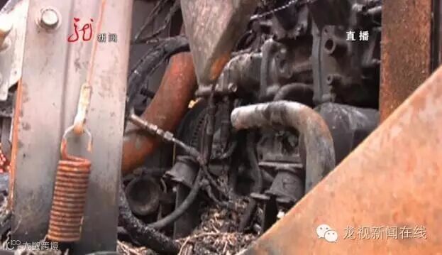 大火着了几十分钟后,终于被扑灭,这时再看这台收割机,那可真叫面目全非。车身通体发黑,电路、水箱、粮仓、发动机全坏了,已经没有维修价值了。
