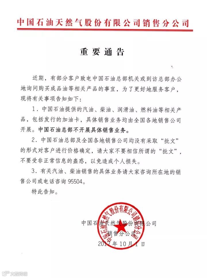 导读:中国石油天然气股份有限公司销售分公司重要通告