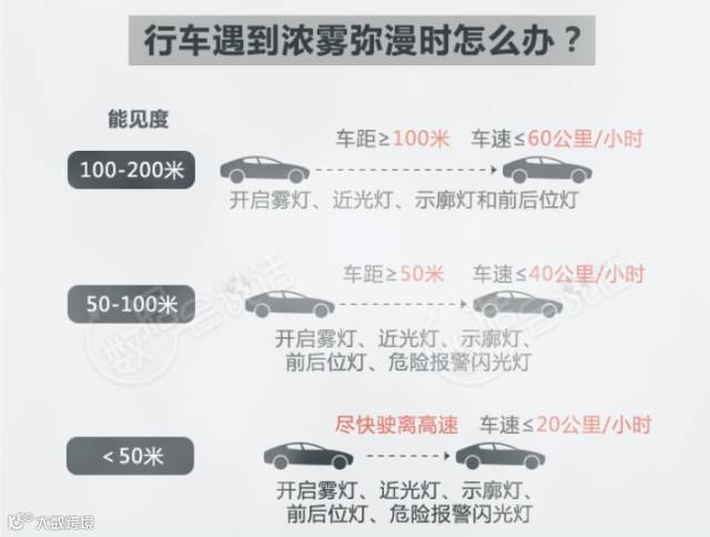 雾霾天气行车应及时打开雾灯、示廓灯、危险报警闪光灯和近光灯,不要使用远光灯,保持安全车距,不要超车。