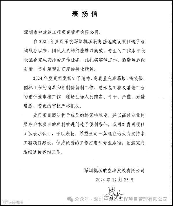 ➤深圳中建达喜获深圳市机场(集团)有限公司2024年度“A类优秀供应商”