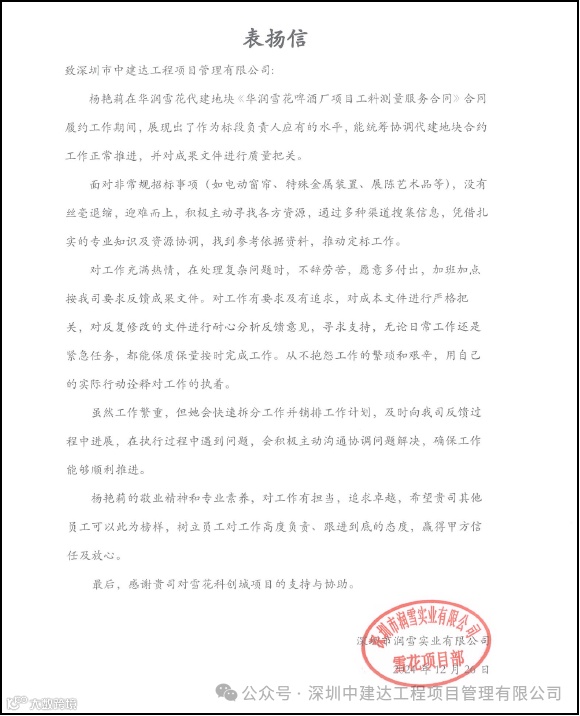 ➭我司顾问团队在华润雪花代建地块《华润雪花啤酒厂项目工料测量服务合同》履约中,顾问负责人展现出的高素质,获得甲方项目部表彰。