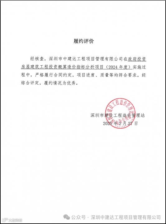 ➭深圳中建达在《政府投资房屋建筑工程投资概算造价指标分析项目(2024年度)》实施过程中,得到深圳市造价站履约评价“优秀”。
