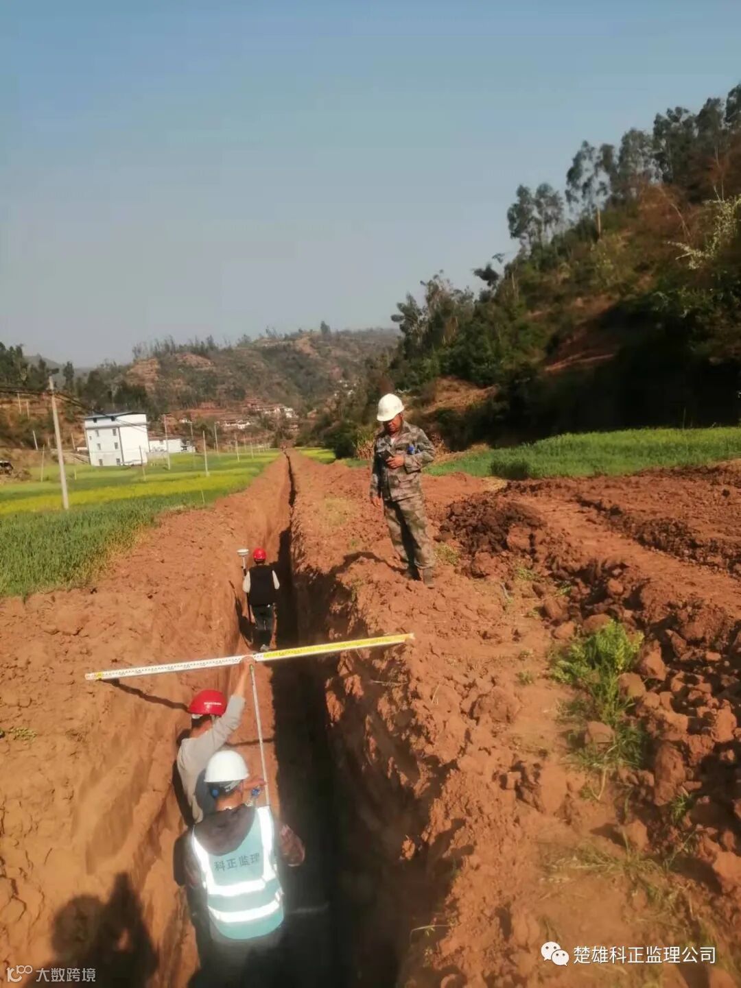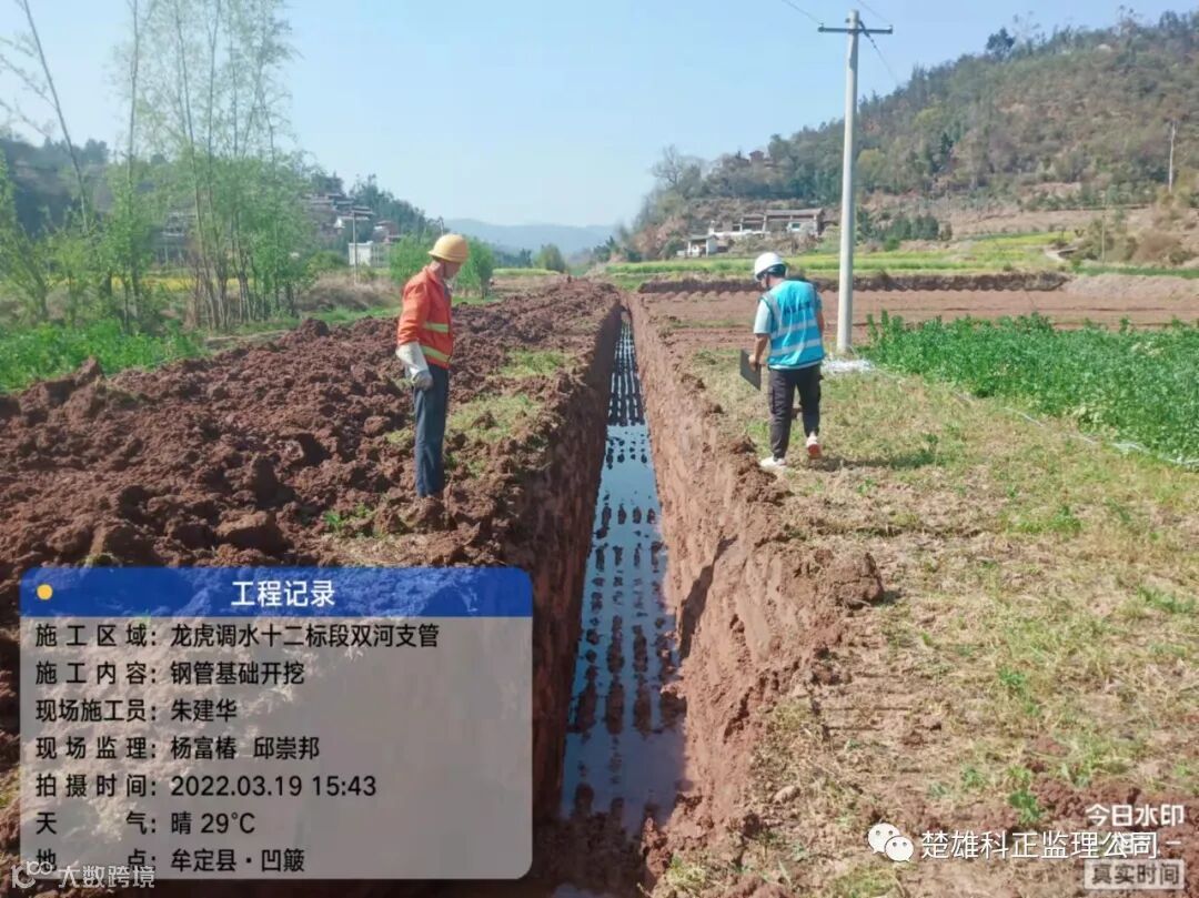 2022年3月19日,牟定县龙虎水库调水工程第十二标段双河支管,钢管基础开挖,杨富椿、邱崇邦等监理人员在工地现场履行监理人员职责。