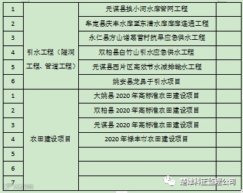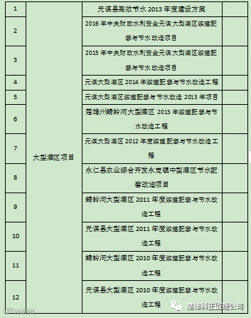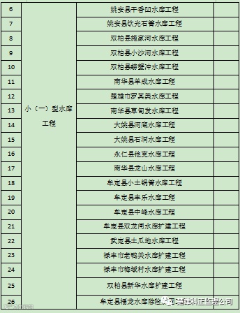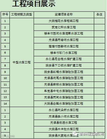 公司从1995年开展建设监理业务以来,以“为业主提供优质服务”为宗旨,已先后承接了100余多件监理项目,经营范围遍布楚雄州八县二市。公司在楚雄州每个县、市都设有项目监理部,每个项目监理部各类专业技术人员其全,年龄层次老中有结合,并随时根据工程需要调整和调配监理人员。多年来,公司先后承接和完成的项目有:武定县仁和水库工程(新建中型)、禄丰县西河水库工程建中型)、永仁县阿朵所新建小(一)型水库工程、永仁县他克新建小(一)型水库工程、南华县羊境新建小(一)型水库工程、姚安县大麦地新建小(一)型水库工程、大姚县河底新建小(一)型水库工元谋县挨小河水库工程、元谋县依洒水库工程、永仁县拉里么新建小(一)型水库工程、大姚县大所建小(一)型水库工程、双柏县施家河新建小(一)型水库工程、牟定县中锋水库扩建工程、牟定县小土锅菁水库工程、姚安县下口坝水库扩建工程(中型)、永仁县尼白租水库扩建工程(中型)、牟定县丰乐水库烟草水源工程、牟定县龙川河道治理工程、双柏县沙甸河道治理工程、姚安县蜻蛉河上段河道治理工程、牟定县石者河培龙村至河底段道治理工程、双柏县河口河麻窝至初都段河道治理工程、武定具营园河九厂集镇段河道治理工程、元谋大型灌区2014年、2015年2016年续建配套与节水改造工程、丰运县中屯水库除险加固工程(中型)、元谋县麻柳水库除险加固工程(中型);承担姚安、元谋、禄丰、楚雄、姚安等三十余件中、小(一)型水库除险加固工程的监理工作;同时,还先后承接了各县、市的引水工程和农村农田建设项目。