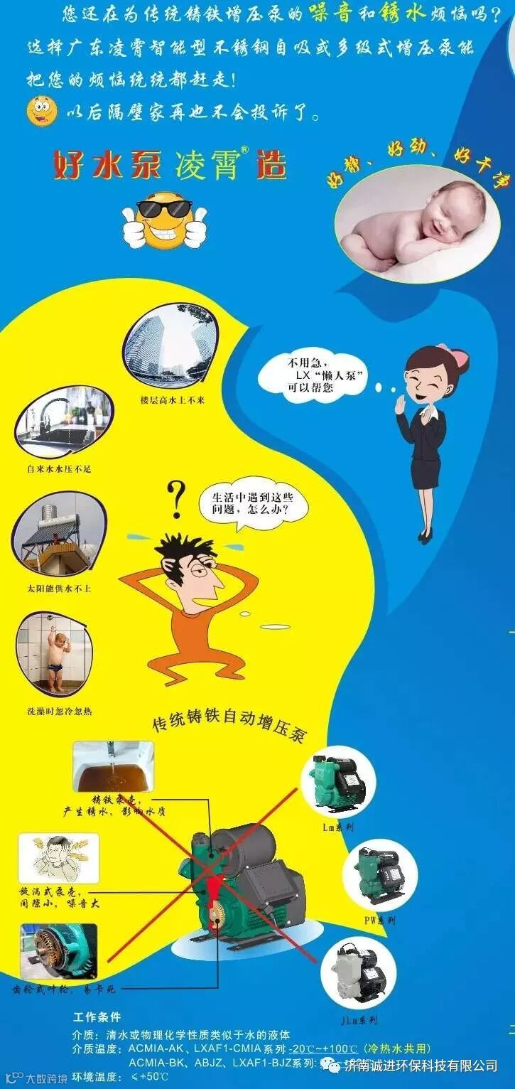 济南诚进环保科技有限公司是一家专业从事水处理配件供应及技术支持与服务一体的新型环保企业。公司以“诚信为本,客户至上,服务最优”的经营理念,为客户提供水处理配件一站式采购的全新体验,公司主营产品:凌霄系列水泵,沁森等品牌,水处理技术交流等