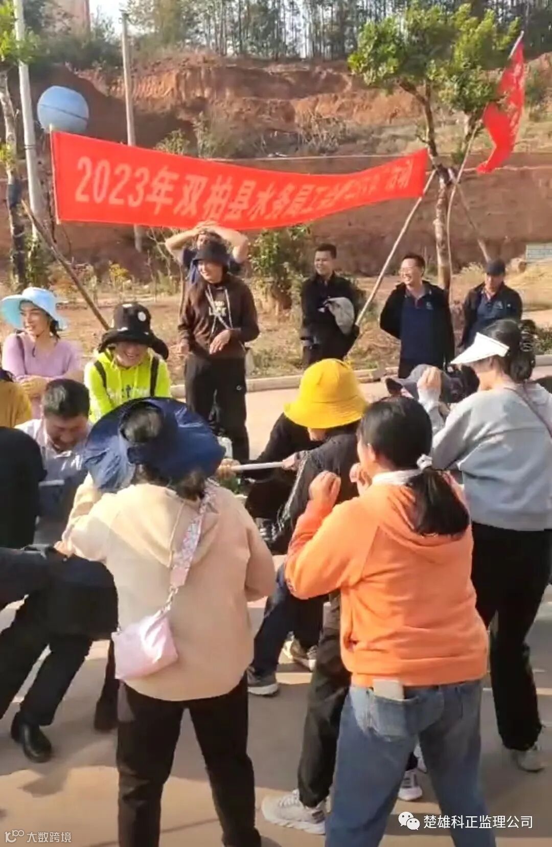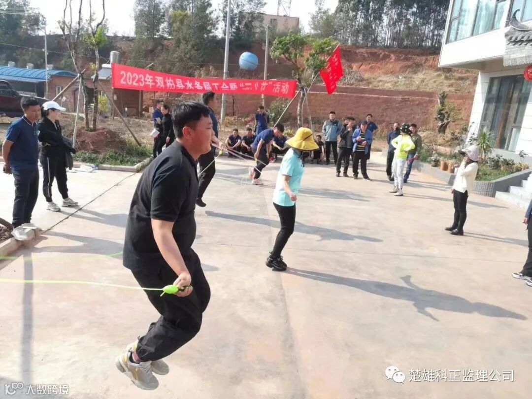 集体跳绳比赛,双柏县水务局工会、科正监理公司每队上场8人(6男2女),时间1分钟,中途跳绳中断仍可继续比赛,但该次跳绳不计数,按跳绳次数最多组获胜。