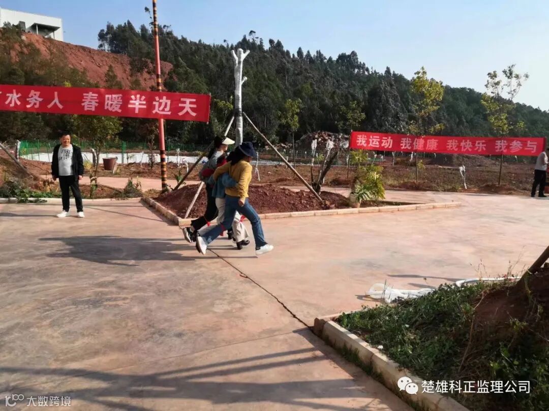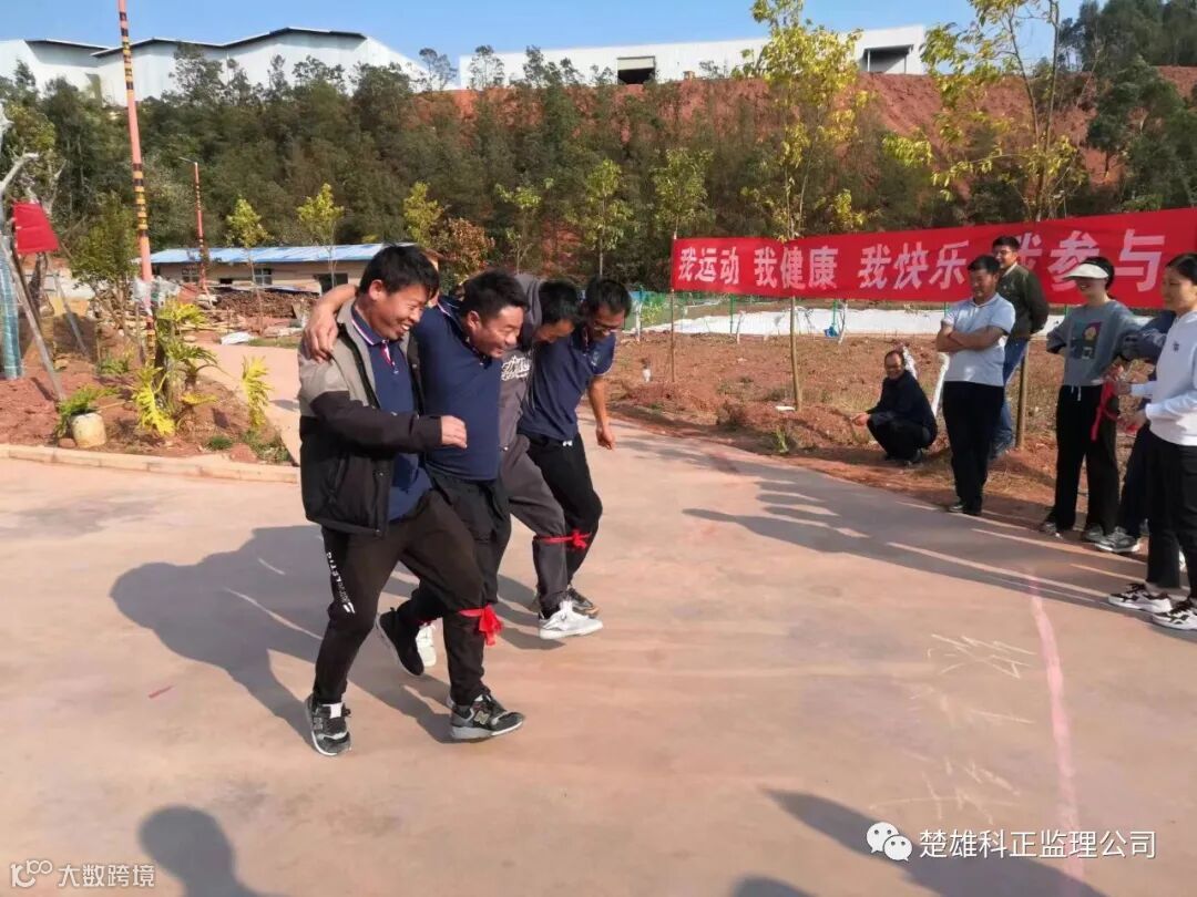 四人五足比赛,4个人一组绑好脚,在规定的距离内,走完全程,以用时最短的前三组获胜。双柏县水务局的职工、科正员工都积极参加活动,他们的面带笑容,步伐和谐一致,正奋力迈向终点。