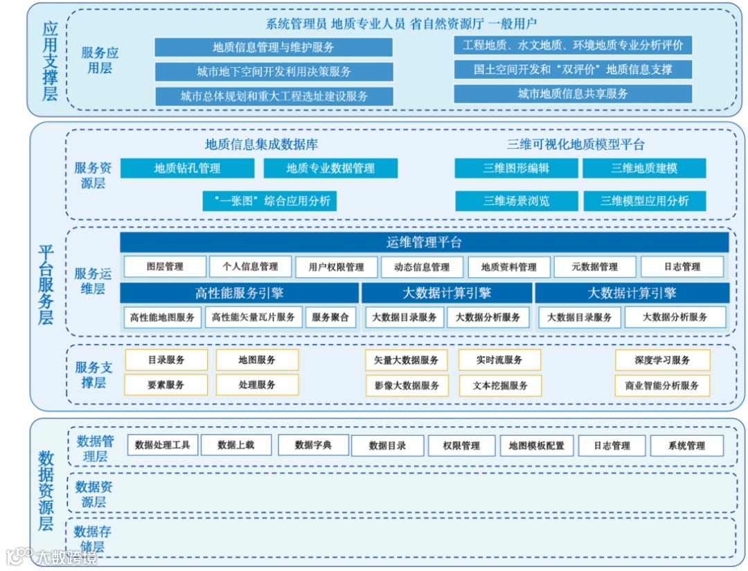城市地质信息综合利用管理平台通过夯实地质数字基础,推动城市地质的精细化管理发展。通过加强地质环境和地质安全动态监测,将三维实景采集、智能视频实时分析、无人机等技术应用与业务活动相结合,实现动静内外结合的监测数据融合,提高地质灾害数据监测的时效性,加强业务数据汇聚,结合气象、水文、交通等行业数据及互联网等共享信息,奠定城市地质大数据分析的基石,实现地质资源开发利用专业评价。以地质环境及地质安全监测和地质综合管理开发利用为基础,为政府各委办局、企事业单位、科研院校、社会公众提供云端互动的差异化城市地质专业、公众信息服务,盘活地质数据资源,提高城市地质工作满意度。