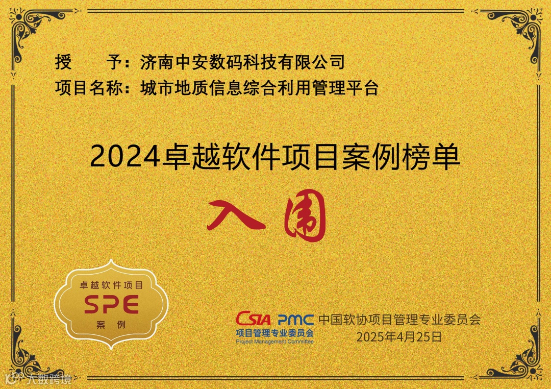 会上,由中国软件行业协会项目管理专业委员会(简称“专委会”)牵头组织的“卓越软件项目案例”征集活动正式揭榜,济南中安数码“城市地质信息综合利用管理平台”项目凭借其领先的科技创新水平和标杆式的行业实践,荣登2024年度卓越软件项目案例榜单。