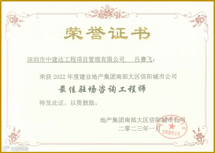▲2023年2月深圳中建达公司成都顾问团队魏亚川、张羽、陈彧泽、杨博等人荣获华润置地华西大区成都片区公司2022年度全过程造价咨询多项奖项。