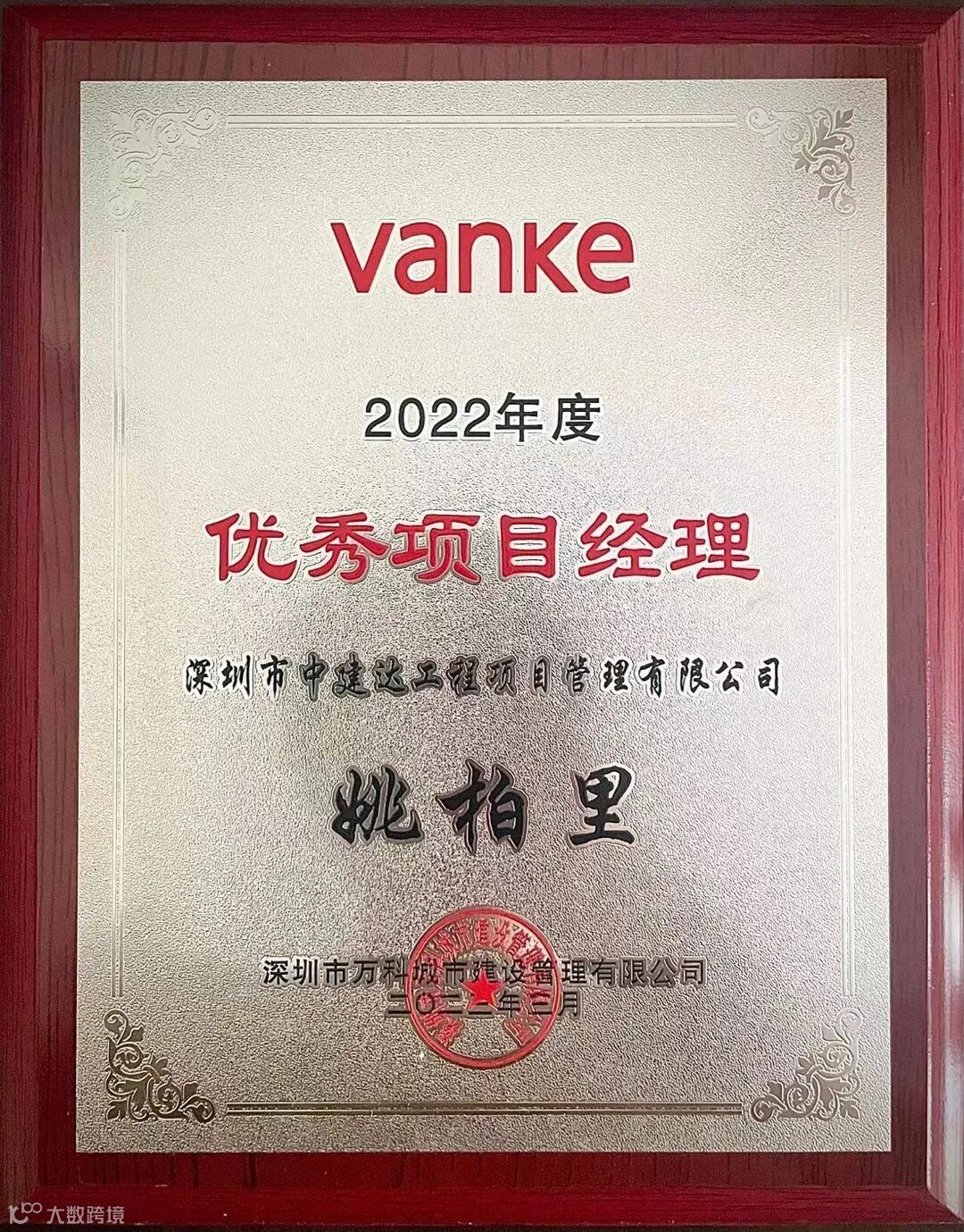 ▲2023年3月深圳中建达公司深圳团队姚柏里荣获万科城建“优秀项目经理奖”