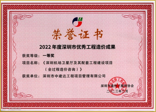 ▲2023年3月深圳中建达公司深圳机场项目团队荣获深圳市造价工程师协会“2022年度深圳市优秀工程造价成果一等奖”