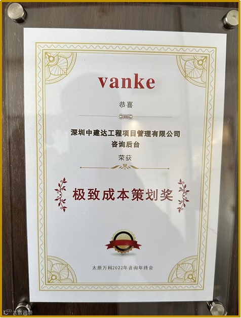 ▲2023年3月深圳中建达公司太原团队荣获太原万科“极致成本策划奖”