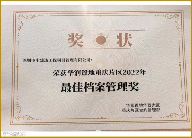 ▲2023年2月深圳中建达公司贵阳团队荣获华润置地重庆片区2022年度 “最佳档案管理奖”