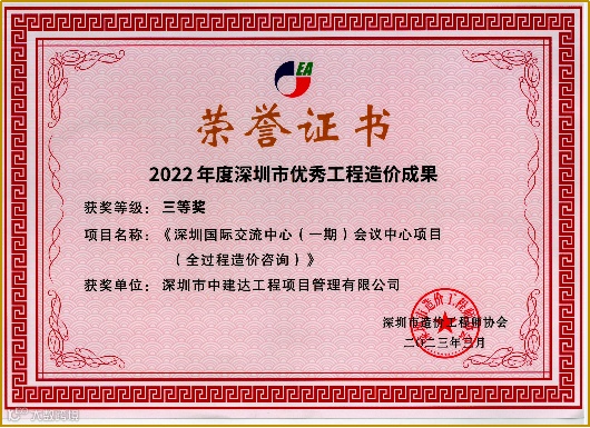 ▲2023年3月深圳中建达公司深圳国交项目团队荣获深圳市造价工程师协会“2022年度深圳市优秀工程造价成果三等奖”