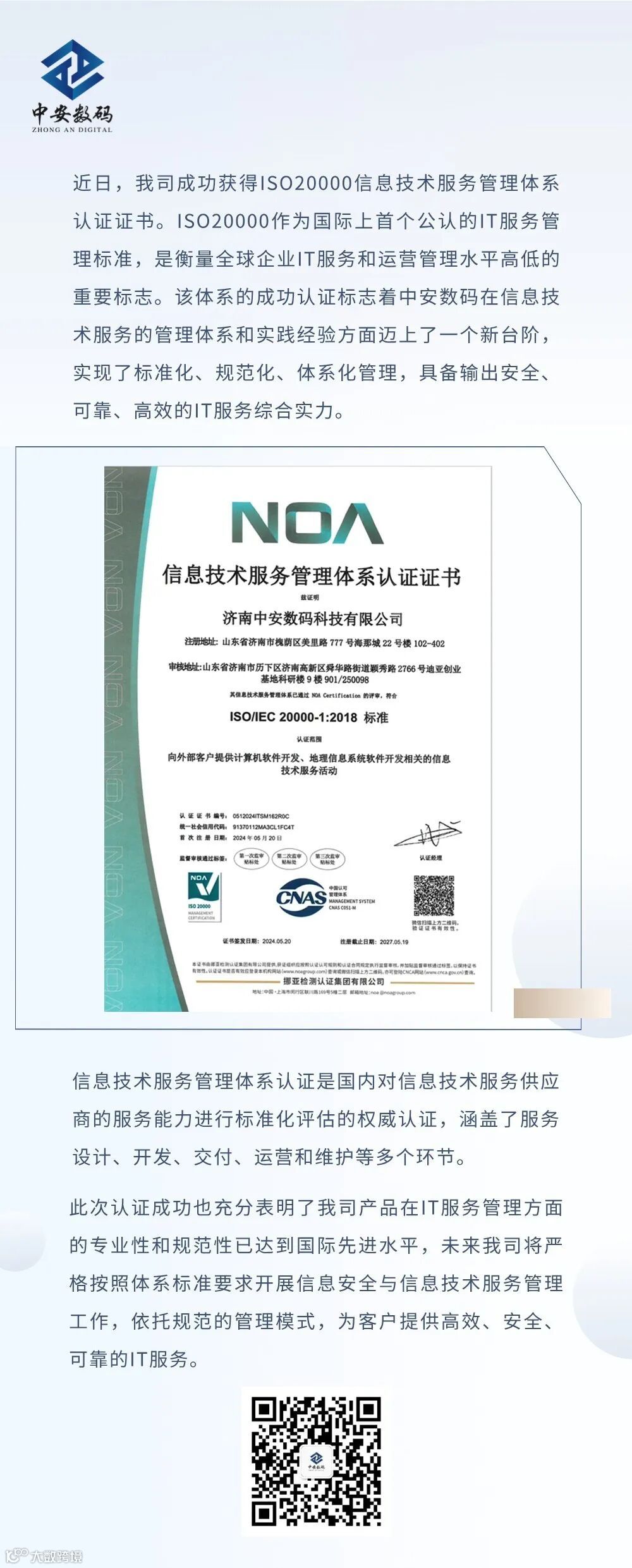 中安数码获ISO20000信息技术服务管理体系认证证书