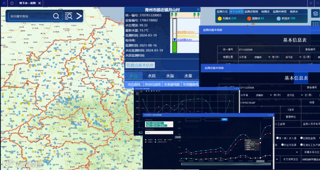 通过一张图可了解监测方式、地下水类型、监测点级别、监测点类型及每个测站的地理位置信息、状态、实时数据,方便、快捷掌握每个监测点状况。