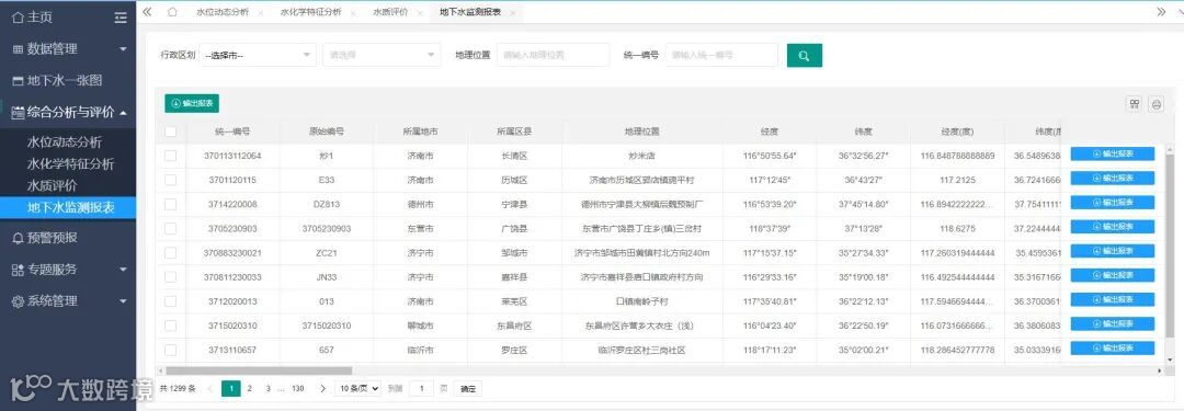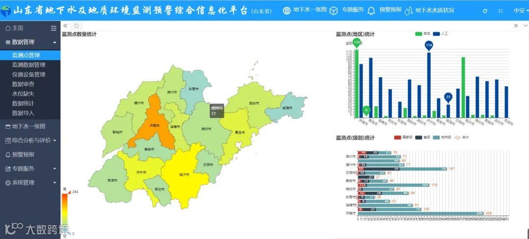 平台根据不同地市进行分权管理,可通过山东省及各地市不同账号进入平台,查看所管辖区域内的监测井以及相关监测数据;山东省的用户可以查看全部的地市的监测数据,而各地市只能查看本地市的监测数据。
