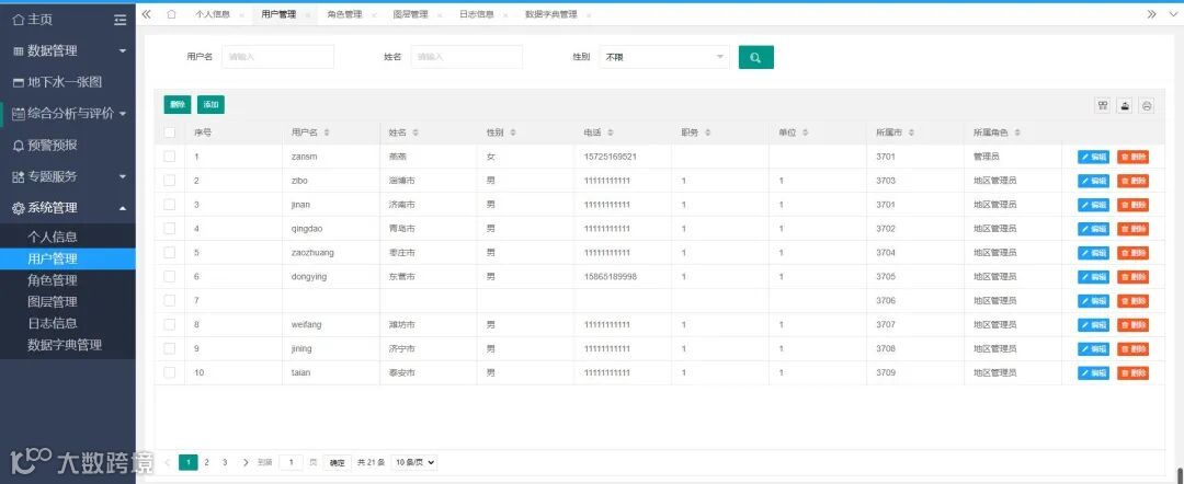 系统管理实现个人信息、用户管理、角色管理、日志管理、地图服务发布功能。该模块具有个人信息编辑和展示功能;用户和角色权限查询、新增、编辑、删除等功能;同时可对用户操作以日志的形式记录,方便查询;实现地图服务自定义添加发布、编辑和删除的功能。