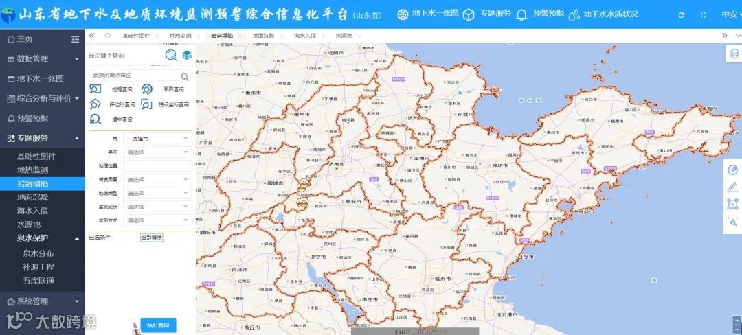 专题服务实现了一些成果图件的叠加显示,以及地热井监测、水源地监测的基本信息的查看,按照行政区划、监测现状、监测方式等进行进一步的查询。
