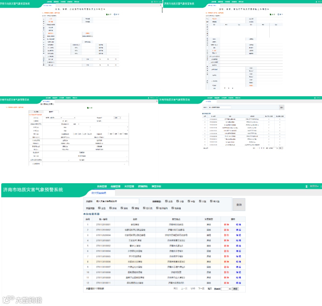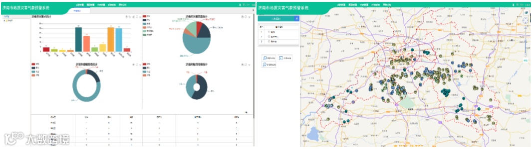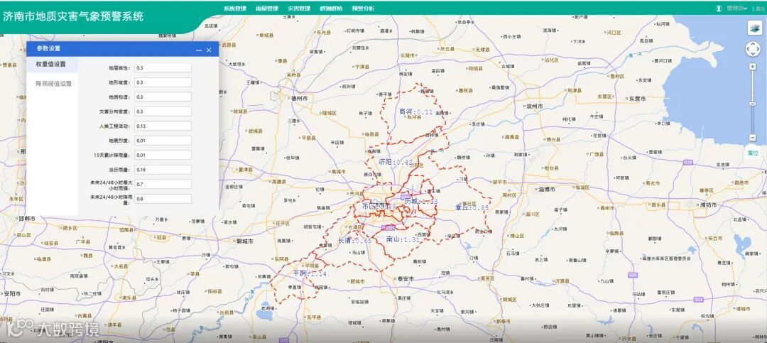 依托济南市级和县级的与地质灾害防治相关的调查、监测等数据,构建济南市地质灾害预警预报平台,形成“平台共享、数据通用、分级负责、实时更新”的模式,做到“市、县”数据信息互联互通,实现了从基础数据调用、预警模型管理、预警参数设置、分析计算、预警产品编辑、预警产品发布的气象风险预警业务全流程智能化管理。
