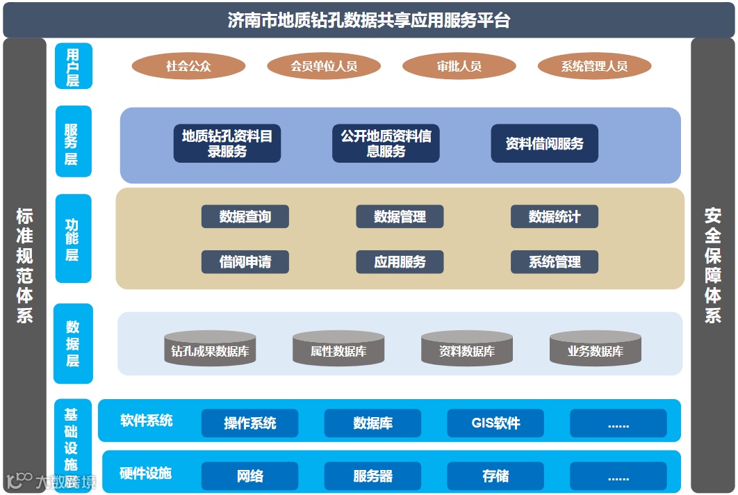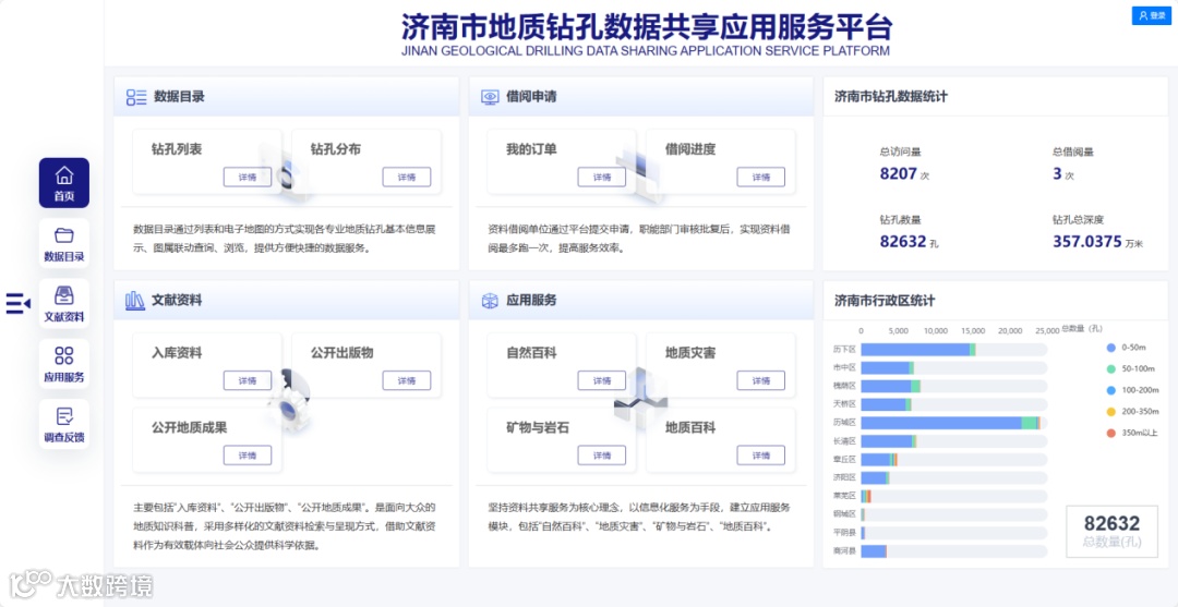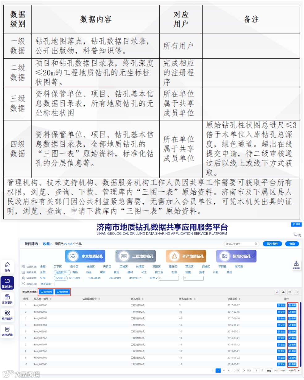 为加强地质资料集中管理,建立跨行业跨部门地质资料汇交共享机制,充分发挥地质资料在国土空间规划建设、自然资源保护利用、乡村振兴、防灾减灾等方面的基础信息支撑作用,进一步推进地质资料社会化服务,构建了济南市地质钻孔数据共享应用服务平台,为政府职能部门、企事业单位、社会公共提供高效便捷的钻孔资料服务。