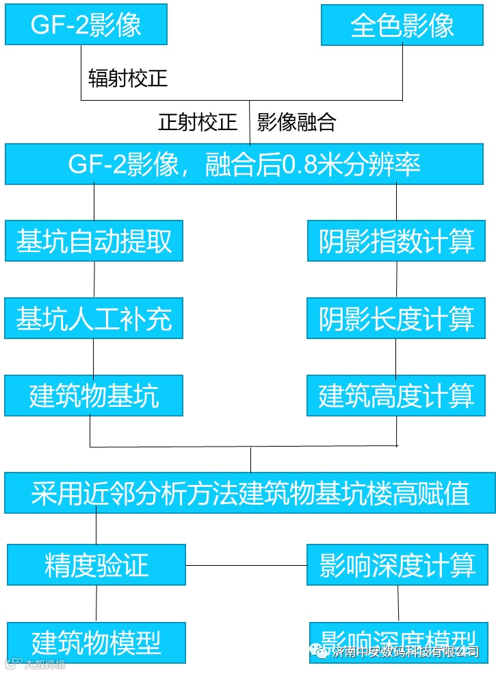基于高分二号卫星影像数据,对工作区域卫星影像数据进行一系列图像预处理操作,并将融合后的影像用于后期面向对象的建筑物基坑识别、单体提取、阴影信息提取以及建筑物高度反演,并对识别提取的结果进行可行性验证以及精度性评价,实现对淄博中心城区(360 k㎡ )范围内建筑物高度和地下空间利用情况的监测评估。