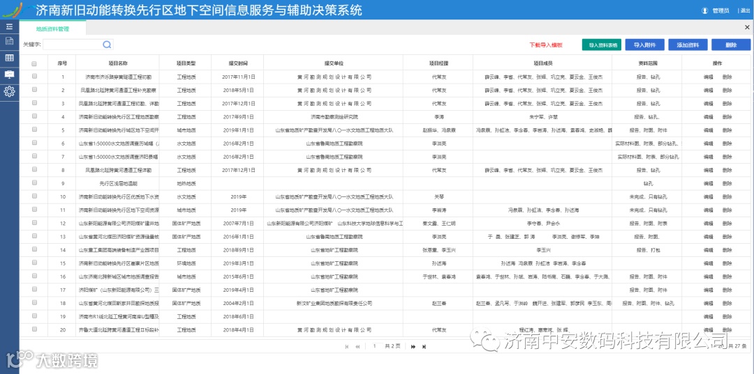 地质资料管理是对断层探测和活动性鉴定、深层地热资源调查、中心区区域地质评价、地下空间资源调查、优质地下水资源勘查、地质服务综合研究等资料进行管理。首先可以下载导入模板进行资料的填写,然后对资料表格或附件进行导入添加资料,也可对已有资料进行编辑和删除。