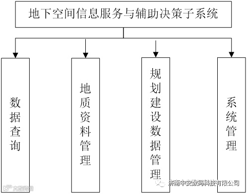 地下空间信息服务与辅助决策子系统功能包括数据查询、地质资料管理、规划建设数据管理、系统管理四大模块。功能结构模块如下图: