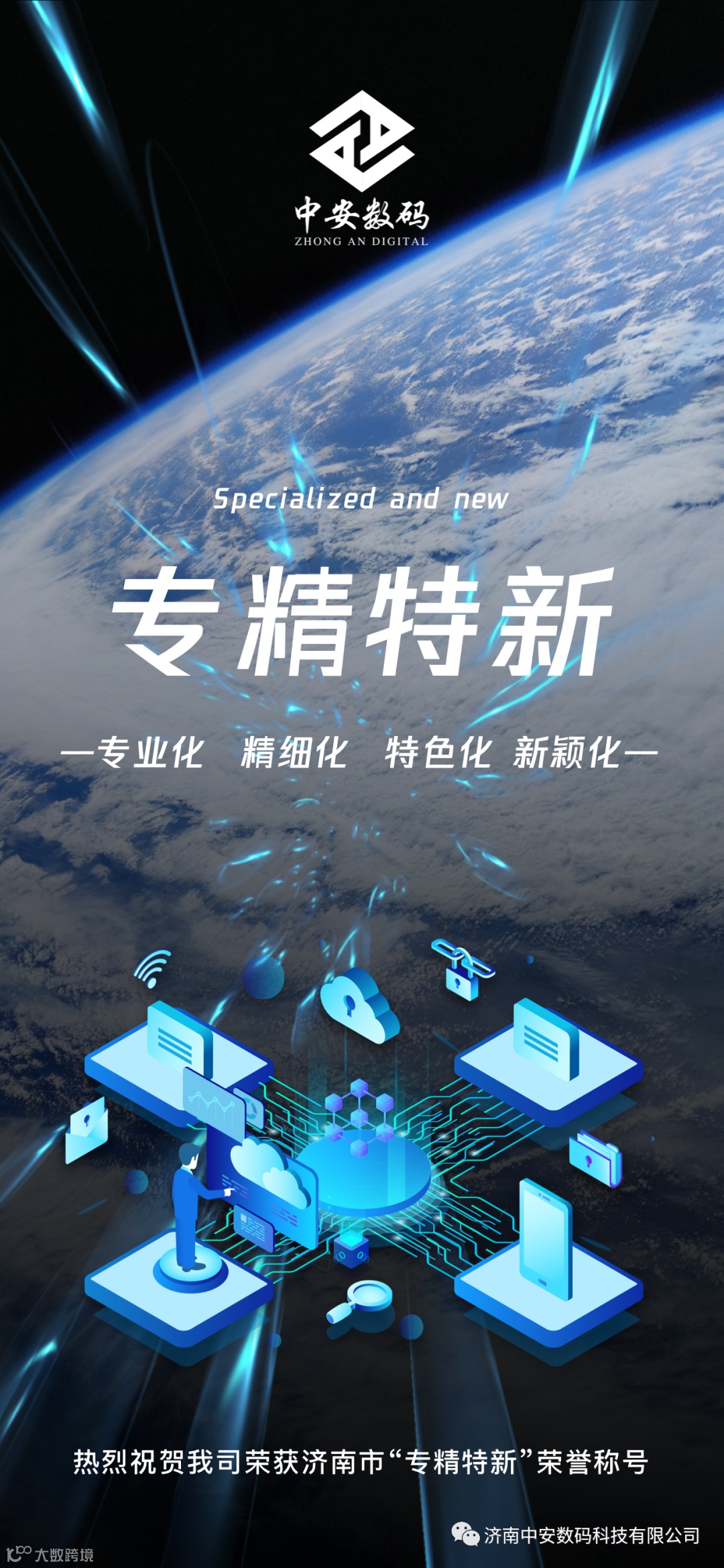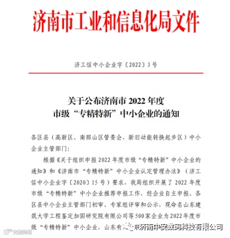 为进一步促进企业升级转型、提升企业综合竞争力,2022年4月25日,济南市工业和信息化局公布了2022年度市级“专精特新”中小企业名单,我司(济南中安数码科技有限公司)荣获济南市“专精特新”荣誉称号。