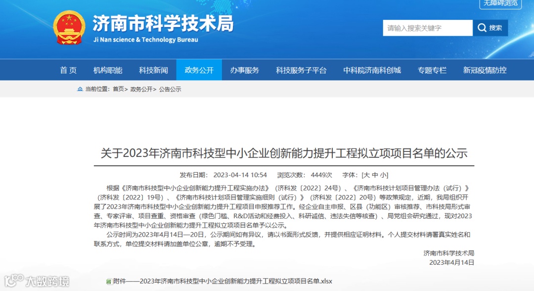 根据《济南市科技型中小企业创新能力提升工程实施办法》(济科发〔2022〕24号)、《济南市科技计划项目管理办法(试行)》(济科发〔2022〕19号)、《济南市科技计划项目管理实施细则(试行)》(济科发〔2022〕20号)等政策规定,济南市科学技术局于2023年4月14日对2023年济南市科技型中小企业创新能力提升工程拟立项项目名单予以公示。