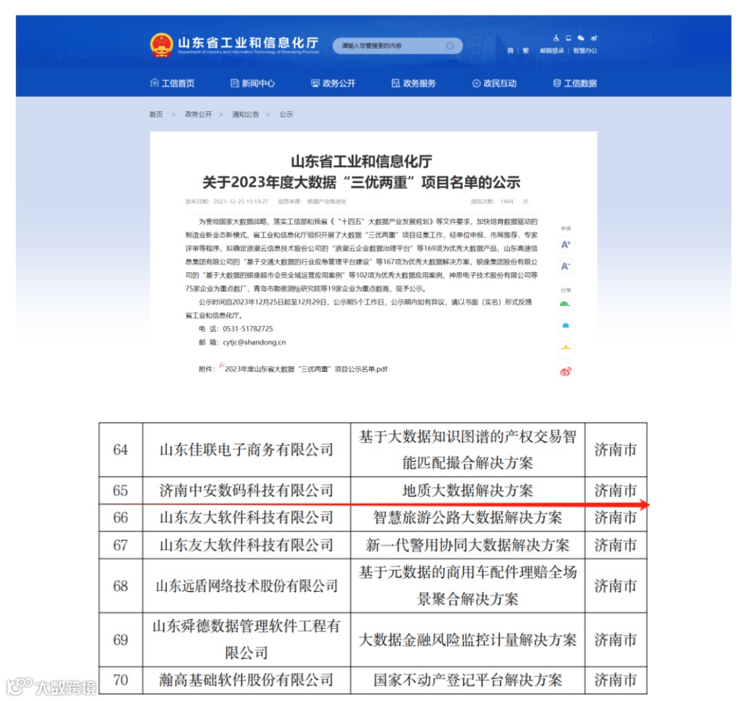 近日,山东省工业和信息化厅发布了2023年度省级大数据“三优两重”项目名单,我司地质大数据解决方案成功入选山东省优秀大数据解决方案。