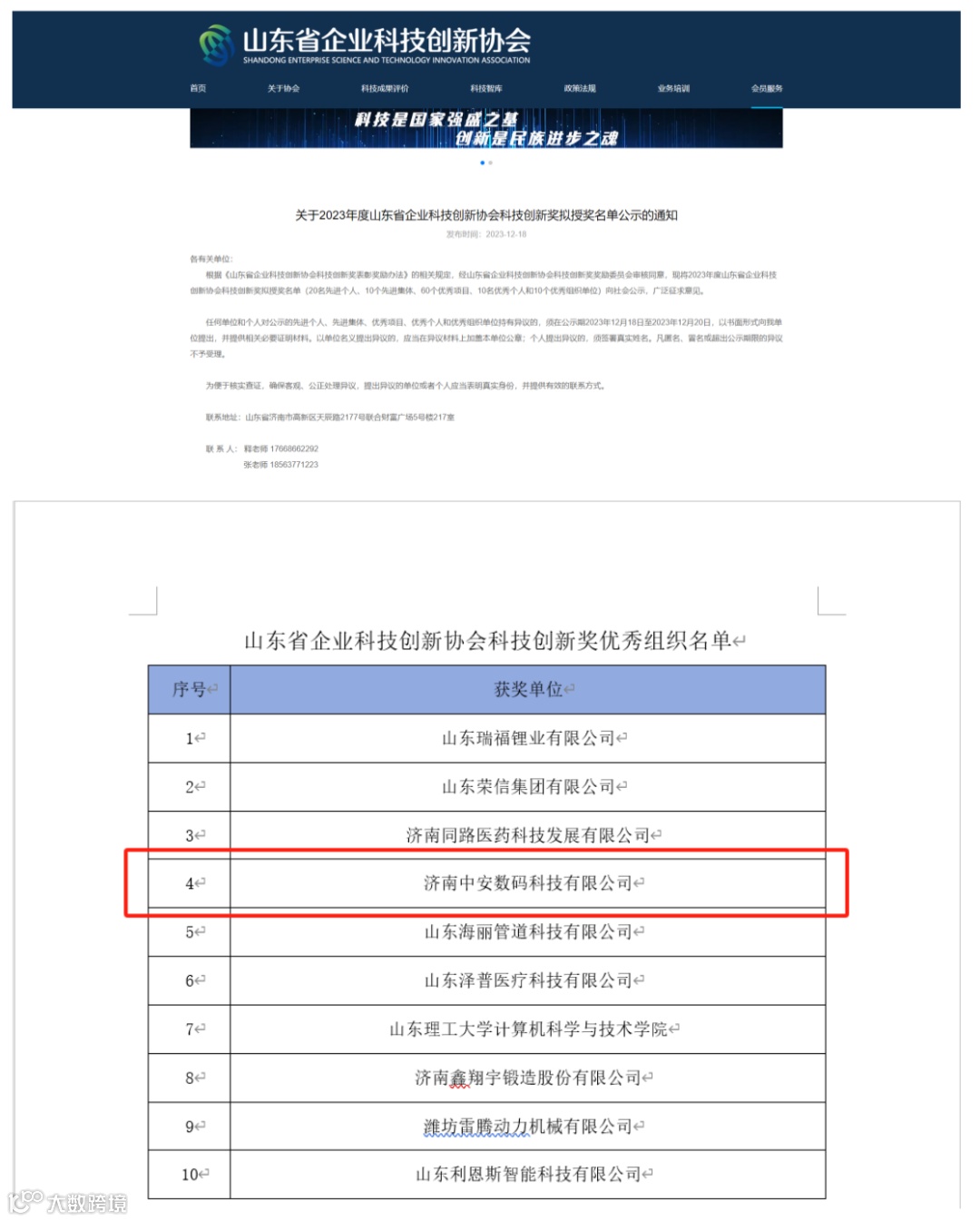 近日,在山东省企业科技创新协会公布的科创奖获奖名单中,济南中安数码科技有限公司荣获优秀组织奖。