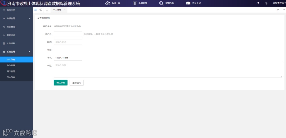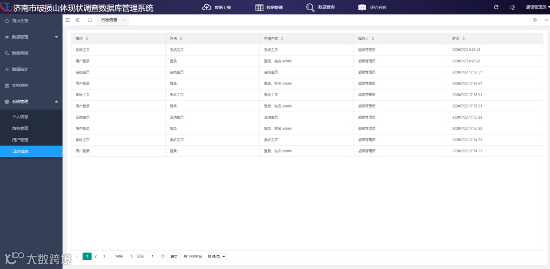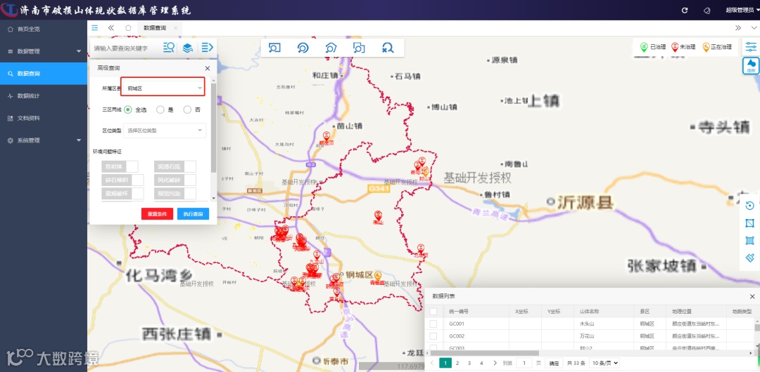 基于济南市破损山体现状调查数据库管理系统包括五个功能模块:数据管理子模块、数据查询子模块、数据统计子模块、文档资料子模块、系统管理子模块,在数据库数据导入后,对数据相应的模块进行功能测试及修改。