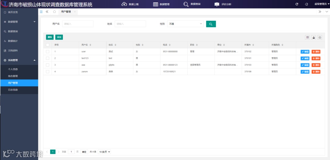 (3)用户管理功能是对用户基本信息,例如姓名、性别、电话、职务、所属单位、所属市、所属角色等信息进行管理,包括信息的添加、编辑、删除、批量删除、查询、筛选、导出、打印等功能。