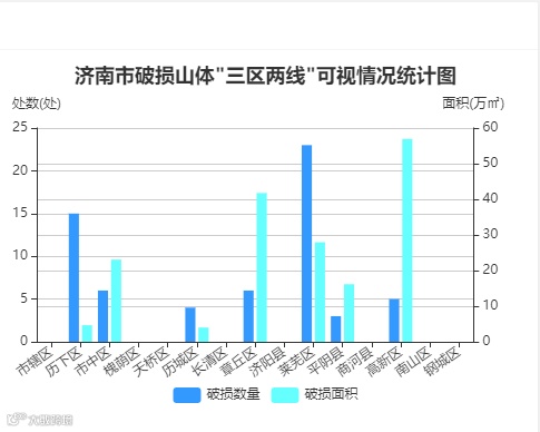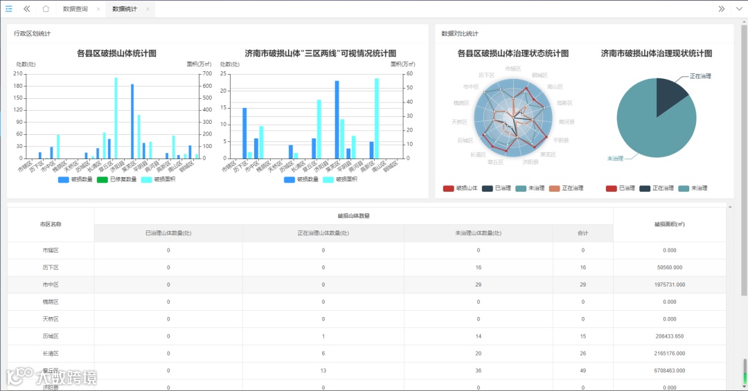 数据对比统计:统计了各区破损山体座数、已修复座数、破损总面积、破损平面、破损立面。如图所示: