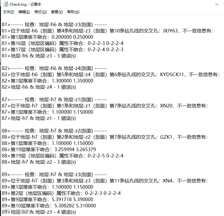 交互剖面检查功能可以检查剖面交叉处属性等信息不一致情况,将二维剖面导入三维场景中,进行检查,检查类型包括属性一致性、层厚一致性、层界一致性、地层区编码四项。将检查出的不一致情况进行修改,通过反复检查、三维导入观察、修改二维数据,直至最终的剖面数据检查无误。
