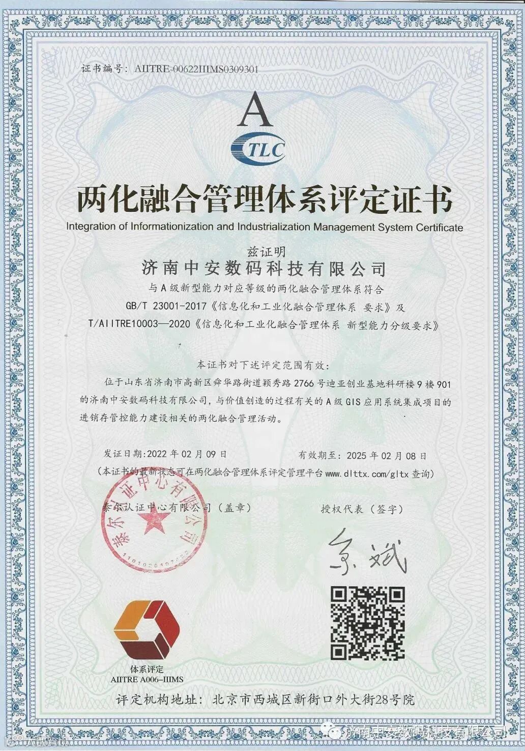 2月9日,济南中安数码获得由国家工信部核定,授权评定机构颁发的《两化融合管理体系评定证书》,标志着公司顺利通过了两化融合管理体系认证,也标志着本公司在推进“信息化和工业化”深度融合、一体化管理体系建设方面进入了一个新的阶段。