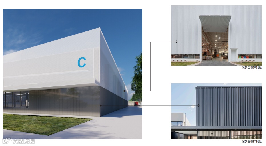 项目设计围绕“可持续发展、绿色生态、以人为本”理念,服务区的立面设计将川流不息的河流动态抽象成简单的建筑语言,通过立面铝板简单对折,在阳光下产生不同的光影效果,形成了视觉的动态感,建筑形态简洁,与“汇川”主题(汇聚百川)相呼应,形成独有的建筑语言。厂区主要采用浅灰色和深灰色彩钢板,整体外观干净整洁。