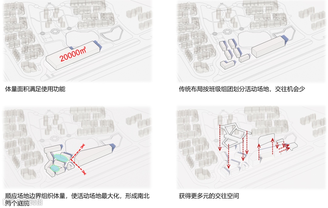 综合场地因素,北院相对安静,拥有良好的朝向及景观视野,为主要活动单元及特色教室区域;南院为紧凑高效的后勤供应、教师办公用房。