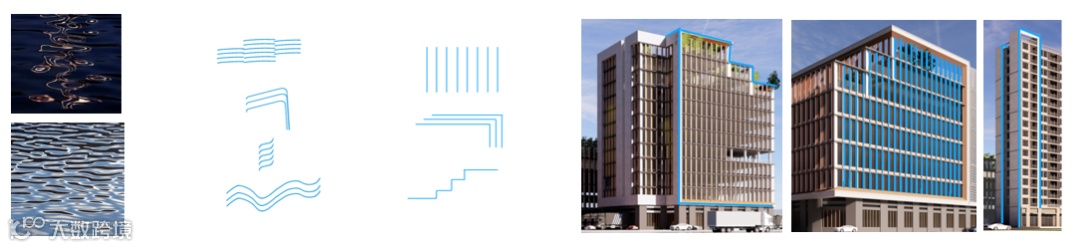 深圳机械院设计团队的创作思路是将整体建筑营造出假玻璃幕的感觉,使用水平横梁和竖线分割,丰富立面层次变化,既可以打造玻璃幕墙效果,又可以节约成本。模型造型的灵感来源于“柔和的水”,采用自然界中的水纹元素进行模型推导,经过提取和转变,在实际造型中运用起来,充分体现品牌的商品理念以及女性的柔和与美。同时,建筑使用了“退台”的设计手法,蕴意品牌发展的步步高升,蒸蒸日上。